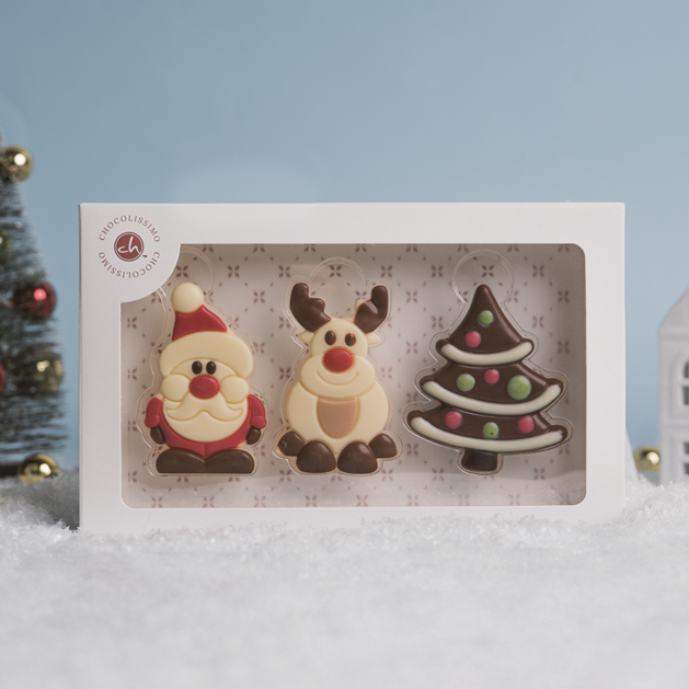 - Trzy bożonarodzeniowe figurki – Mikołaja, choinkę i renifera, wykonane z połączenia belgijskiej czekolady mlecznej, białej i deserowej.