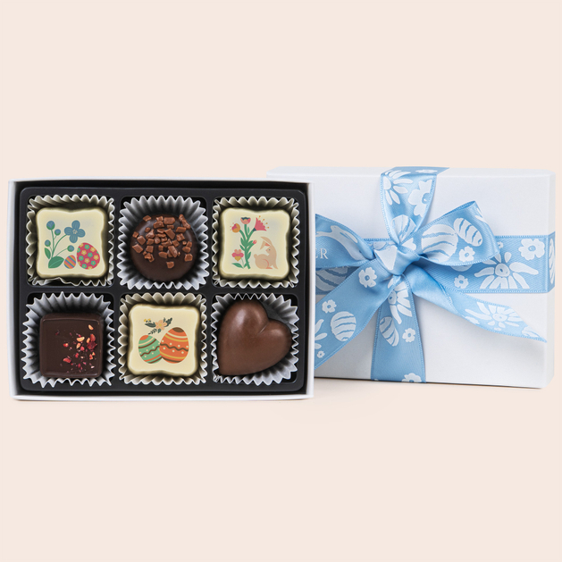 Wielkanocny nadruk zdobi połowę pralin, nadając im świątecznego charakteru. Słodkości te powstały wyłącznie z belgijskiej czekolady najwyższej jakości, pod okiem najlepszych europejskich czekoladników i są wypełnione pysznymi nadzieniami z selektywnie dobieranych składników zapewniających rozkosz. To doskonały sposób na słodki upominek, który zachwyci smakiem i unikalnym stylem.