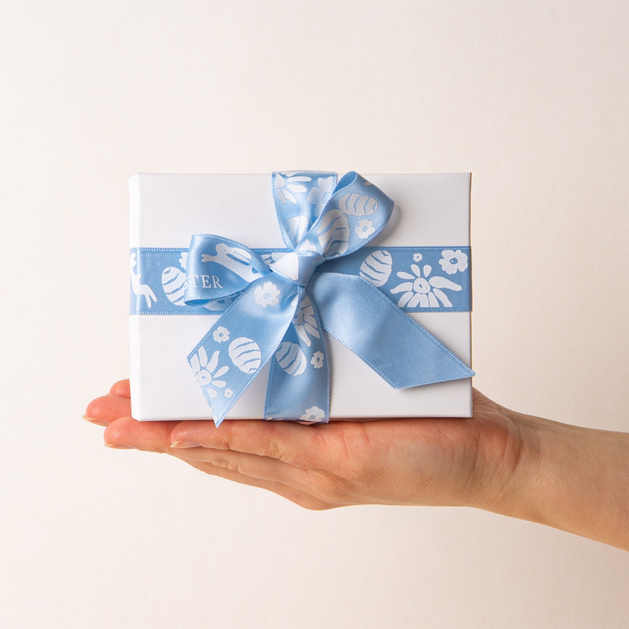 Pralinki zapakowane są w elegancki, biały kartonik przewiązany błękitną świąteczną wstążką, co sprawia, że prezent jest gotowy do wręczenia. To idealny wybór na prezent wielkanocny, zarówno dla rodziny, jak i współpracowników.