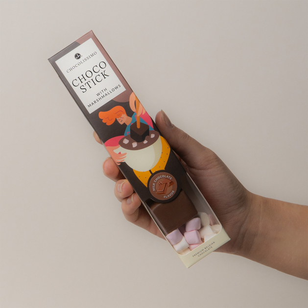 Mleczna belgijska czekolada najwyższej jakości połączona z pysznymi piankami marshmallow w formie Chocosticka to idealny sposób na rozgrzewkę podczas zimnych wieczorów. Wystarczy zanurzyć ją w gorącym mleku, by stworzyć aksamitny, kremowy napój, który otula smakiem i daje chwilę słodkiej przyjemności. To szybki i pyszny sposób, by poczuć prawdziwą magię belgijskiej czekolady w domowym zaciszu.