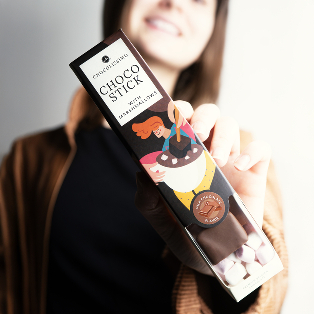 Każdy mleczny ChocoStick jest pakowany ręcznie tuż przed wysyłką, dzięki czemu zachowuje maksymalną świeżość i pełnię smaku. Całość zamknięta w eleganckim, artystycznym opakowaniu – dopracowanym w każdym detalu, idealnym zarówno jako prezent, jak i chwila przyjemności tylko dla siebie.