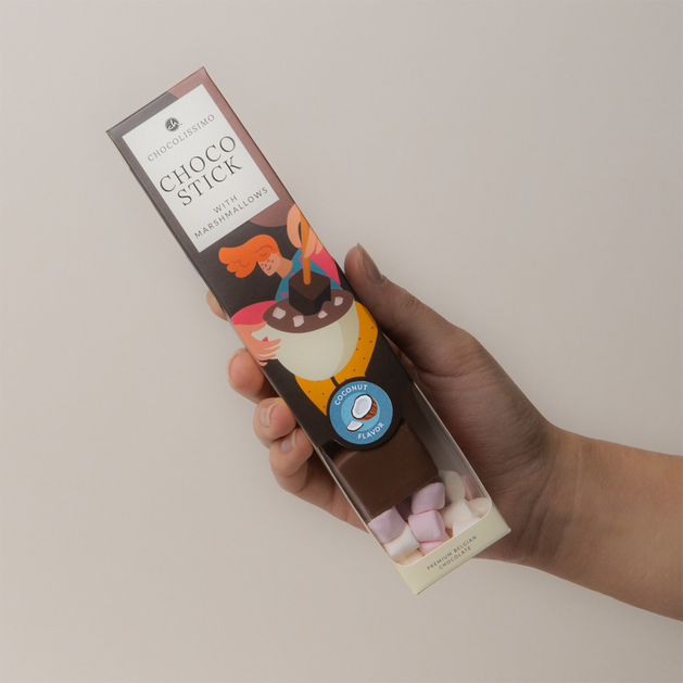 Mleczna belgijska czekolada najwyższej jakości z dodatkiem aromatycznego kokosa połączona z pysznymi piankami marshmallow w formie Chocosticka to doskonały sposób na rozgrzewkę w chłodne wieczory. Wystarczy zanurzyć ją w gorącym mleku, aby uzyskać aksamitny, kremowy napój o idealnym balansie słodyczy i delikatnego kokosowego akcentu. To szybka i pyszna chwila przyjemności, która otula smakiem i wprowadza odrobinę egzotyki do domowego relaksu.