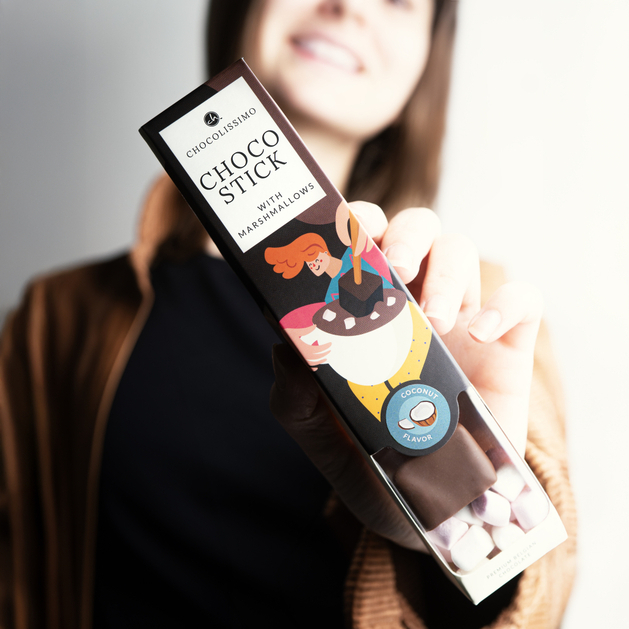 Każdy ChocoStick Kokosowy jest pakowany ręcznie tuż przed wysyłką, dzięki czemu zachowuje maksymalną świeżość i pełnię smaku. Całość zamknięta w eleganckim, artystycznym opakowaniu – dopracowanym w każdym detalu, idealnym zarówno jako prezent, jak i chwila przyjemności tylko dla siebie.