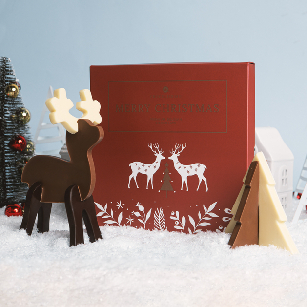 Czekoladowa choinka i renifer powstają ręcznie w naszej pracowni Chocolissimo z najwyższej jakości belgijskiej czekolady - aksamitnej mlecznej, wyrazistej deserowej oraz delikatnej białej. Połączenie tych trzech rodzajów czekolady tworzy harmonijną kompozycję smaków i subtelnie podkreśla każdy detal figurki.
