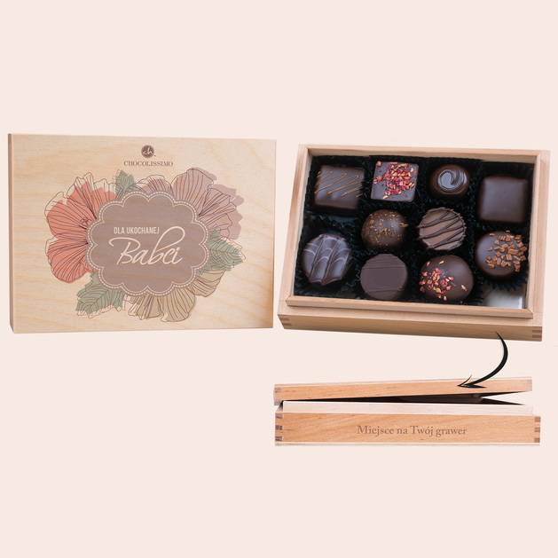 Zaskocz swoją Babcię wyjątkowym upominkiem, który łączy elegancję z doskonałym smakiem! W pięknej, drewnianej szkatułce z kwiatowym motywem kryje się 10 ręcznie wykonanych pralinek, stworzonych z najwyższej jakości belgijskiej czekolady deserowej. Każda pralinka to kunsztownie wykonane dzieło sztuki, przygotowane przez najlepszych europejskich mistrzów czekoladnictwa. Dedykacja „Dla Ukochanej Babci” oraz możliwość dodania grawera sprawiają, że ten prezent nabiera osobistego i wyjątkowego charakteru. To idealny sposób, aby wyrazić swoje uczucia i podziękować Babci za wszystko, co dla Ciebie zrobiła.Wyjątkowe cechy zestawu 10 deserowych pralinek w drewnianej szkatułce z dedykacją dla Babci