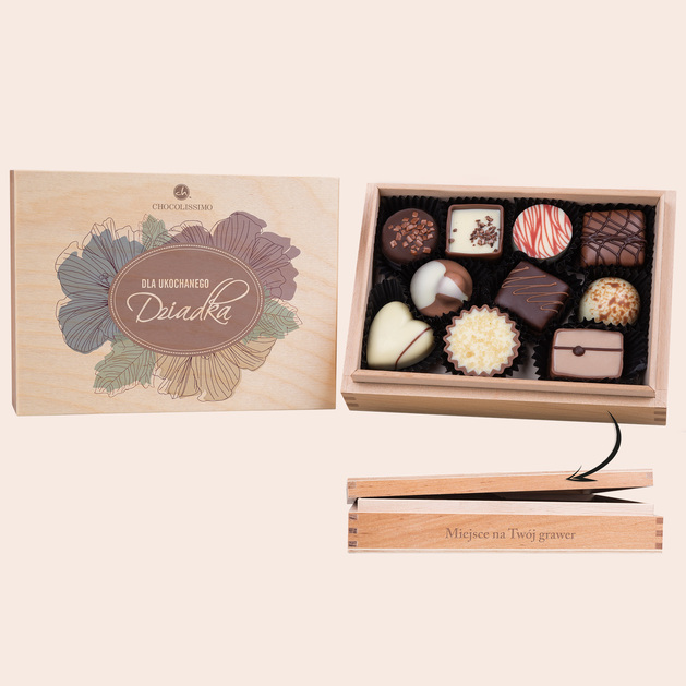 Podaruj swojemu Dziadkowi wyjątkowy prezent, który zachwyci smakiem i estetyką! Nasza skrzyneczka, wykonana z wysokiej jakości drewna, skrywa 10 ręcznie wykonanych pralinek z czekolady. Te małe, słodkie pralinki dla dziadka, o różnorodnych formach i smakach, powstały z najwyższej jakości belgijskiej czekolady pod okiem najlepszych europejskich mistrzów czekoladnictwa. Skrzyneczkę zdobi subtelna grafika z napisem „Dla Ukochanego Dziadka”, a dodatkowo możesz wzbogacić prezent, zamawiając autorski grawer z własnym przesłaniem, aby nadać mu jeszcze bardziej osobisty charakter.