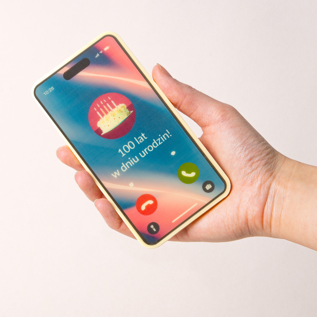 Ekran zdobi jadalny nadruk inspirowany prawdziwym interfejsem telefonu, wzbogacony o urodzinową wiadomość „100 lat w dniu urodzin”. To właśnie ten detal sprawia, że smartphone z czekolady na urodziny 100 lat staje się nie tylko słodkim gadżetem, ale także wyjątkową formą złożenia życzeń. Całość pakowana jest ręcznie w eleganckie pudełeczko naszego projektu i wykonania, dzięki czemu czekoladowy telefon na urodziny z życzeniami 100 lat jest gotowy do wręczenia od razu po otrzymaniu.