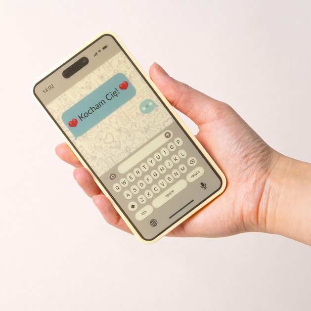 Na ekranie czekoladowego smartphona widnieje jadalny nadruk z wysłaną wiadomością „Kocham Cię”, który w wyjątkowy sposób łączy nowoczesną formę z ciepłymi emocjami. Ten słodki nośnik miłosnego wyznania zamienia klasyczny SMS w wzruszający gest, czyniąc prezent nie tylko efektownym, ale przede wszystkim pełnym uczuć i niezapomnianych emocji.