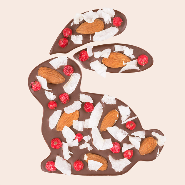 Wielkanocna tabliczka w kształcie zajączka z mlecznej czekolady z porzeczkami, migdałami i chipsami kokosowymi
