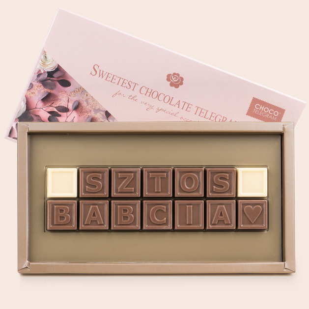 - Pełne uznania przesłanie – Telegram składa się z 14 kostek czekolady, które układają się w chwytliwe i pełne miłości słowa „Sztos Babcia”.