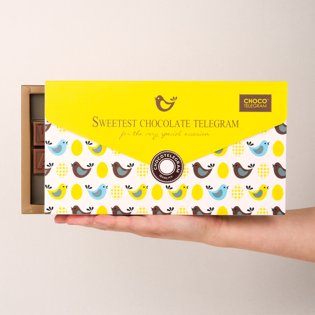 Całość zapakowana została w ozdobną, żółtą kopertę przyozdobioną motywem kurek, idealnie wpisującą się w wiosenny i świąteczny klimat Wielkanocy. Telegram tworzony i pakowany jest bezpośrednio przed wysyłką, co gwarantuje maksymalną świeżość oraz doskonały smak.