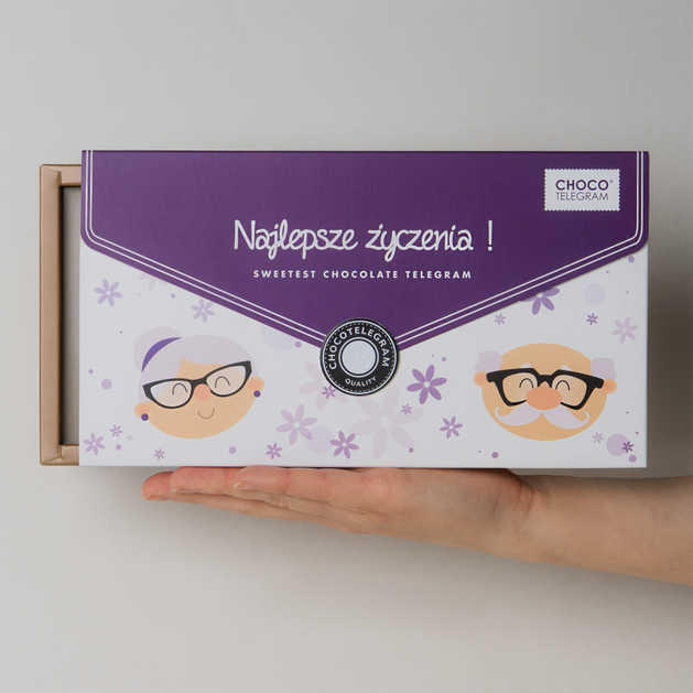 Są życzenia, które płyną prosto z serca i niosą ze sobą prawdziwe emocje. „Dużo zdrowia Babciu” to piękne, pełne troski przesłanie, które w czekoladowej formie zyskuje wyjątkowy charakter. Czekoladowy Telegram® „Dużo zdrowia Babciu” składa się z 21 kostek belgijskiej czekolady najwyższej jakości – mlecznej i białej, które wspólnie tworzą wzruszające, pełne miłości życzenia dla ukochanej Babci. Jedna z kostek została ozdobiona jadalnym nadrukiem z pociesznym wizerunkiem babci, który dodaje całości uroku, lekkości i wywołuje uśmiech już przy pierwszym spojrzeniu.