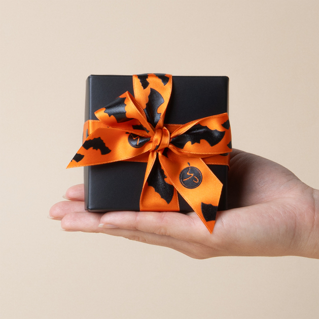 Eleganckie czarne pudełeczko zostało przewiązane pomarańczową wstążką ozdobioną motywem nietoperzy, która idealnie wpisuje się w klimat Halloween. Ten mroczny detal nie tylko dopełnia całość wizualnie, ale też dodaje odrobiny straszliwej magii, sprawiając, że zestaw prezentuje się wyjątkowo stylowo i okazjonalnie.