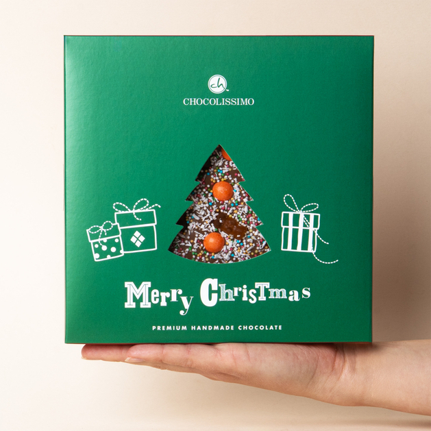 - Eleganckie opakowanie prezentowe – zielony kartonik z okienkiem pięknie eksponuje czekoladę i dodaje całości świątecznego charakteru.