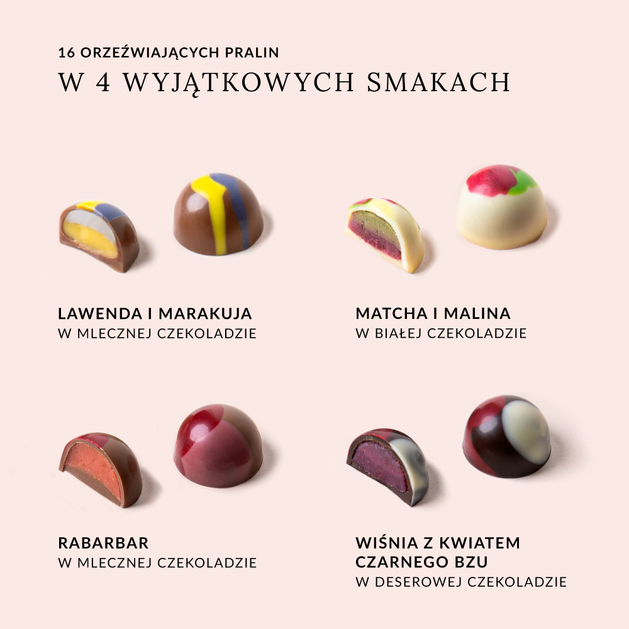 Zestaw pralinek zachwyca różnorodnością starannie skomponowanych, świeżych smaków. Wśród nich znajduje się pralina z nadzieniem z herbaty matcha połączonej z malinami, otulona białą belgijską czekoladą. Kolejna propozycja to pralina z aksamitnym nadzieniem rabarbarowym w mlecznej czekoladzie. Całość uzupełnia delikatne połączenie lawendy i marakui w mlecznej czekoladzie oraz intensywna pralina z deserowej czekolady z wiśniowym nadzieniem wzbogaconym nutą kwiatu czarnego bzu.