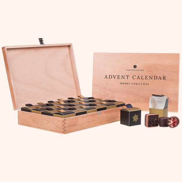 Drewniana skrzyneczka zapinana na metalową klamrę skrywa wyjątkowy kalendarz adwentowy Merry Christmas z pralinkami w miniprezentach – 24 czekoladowe niespodzianki, które każdego grudniowego dnia umilą oczekiwanie na Święta. Wewnątrz znajdują się ręcznie wykonane pralinki z najwyższej jakości belgijskiej czekolady, wypełnione różnorodnymi nadzieniami przygotowanymi z selektywnie dobranych składników.