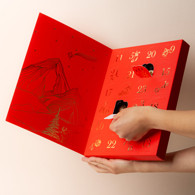 - Wyjątkowe opakowanie – czerwony kolor i złote detale czynią z kalendarza stylowy element grudniowej celebracji.