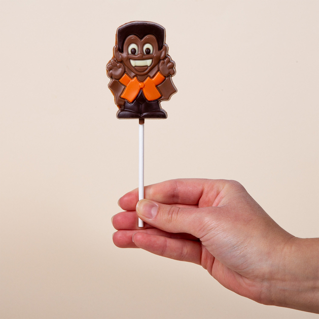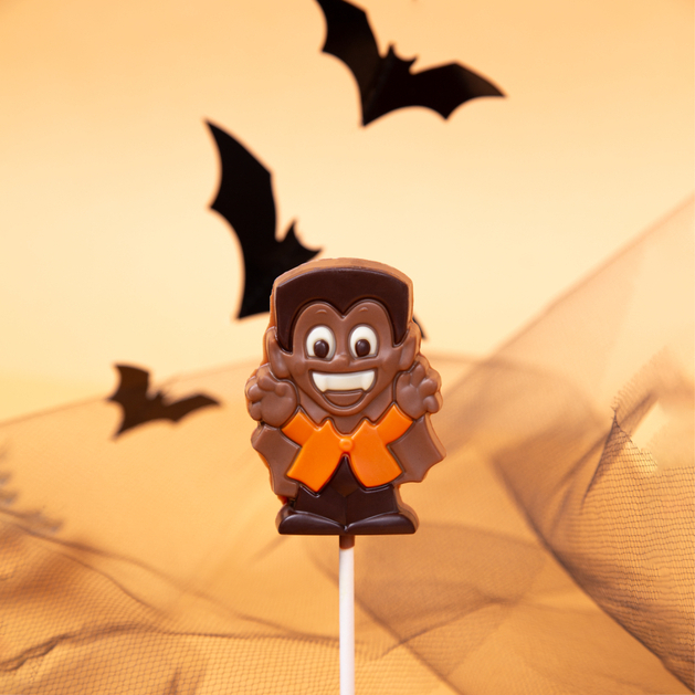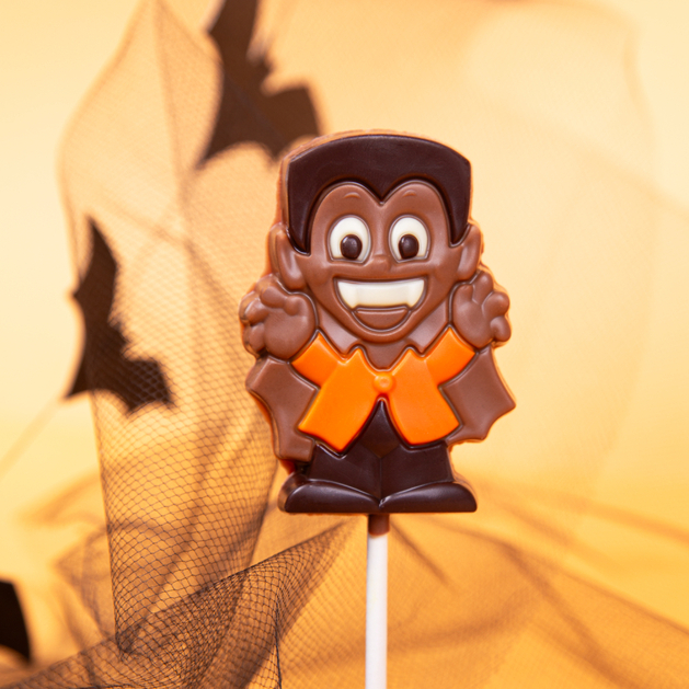 Szukasz oryginalnego upominku na Halloween? Nasz wampir z czekolady w formie lizaka to smakowite połączenie najwyższej jakości belgijskiej czekolady mlecznej, deserowej i białej. Bazę tworzy aksamitna mleczna czekolada, a detale wykonane z deserowej i białej nadają mu wyjątkową głębię smaku i zabawny charakter. Każdy lizak pakowany jest bezpośrednio przed wysyłką w ozdobną folię prezentową, co gwarantuje maksymalną świeżość i gotowość do wręczenia. Dracula z czekolady to doskonały wybór zarówno na słodki dodatek do halloweenowej imprezy, jak i oryginalny „cukierek” do rozdawania.