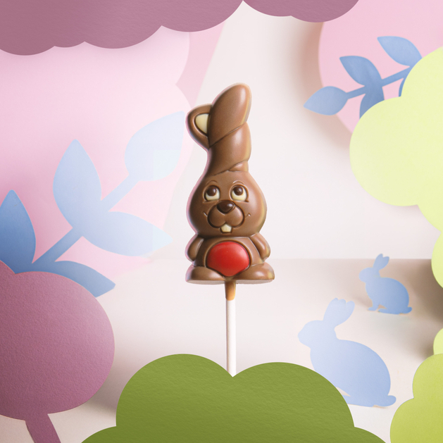 Lizak zajączek z najwyższej jakości belgijskiej czekolady powstał z połączenia kremowej czekolady mlecznej z dekoracjami z czekolady deserowej, białej oraz barwionej, tworząc harmonijną całość, która zachwyca intensywnością i bogactwem smaku.
