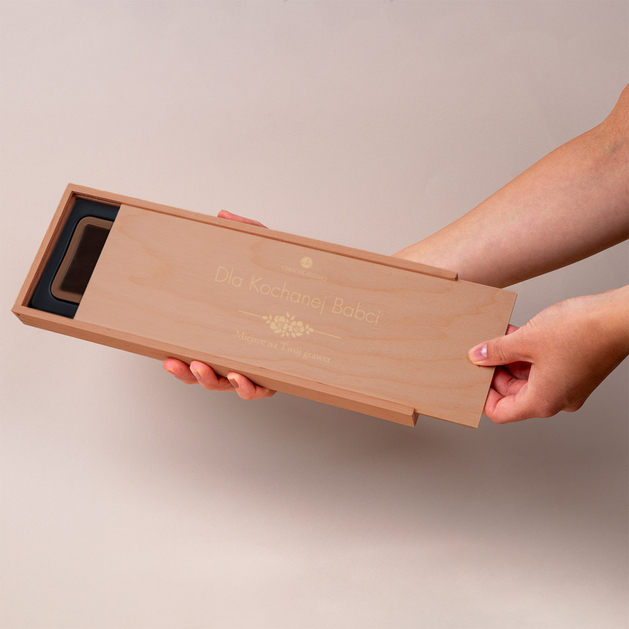 - Drewniana skrzyneczka de Luxe z dedykacją – elegancka oprawa, która podkreśla wyjątkowość prezentu.