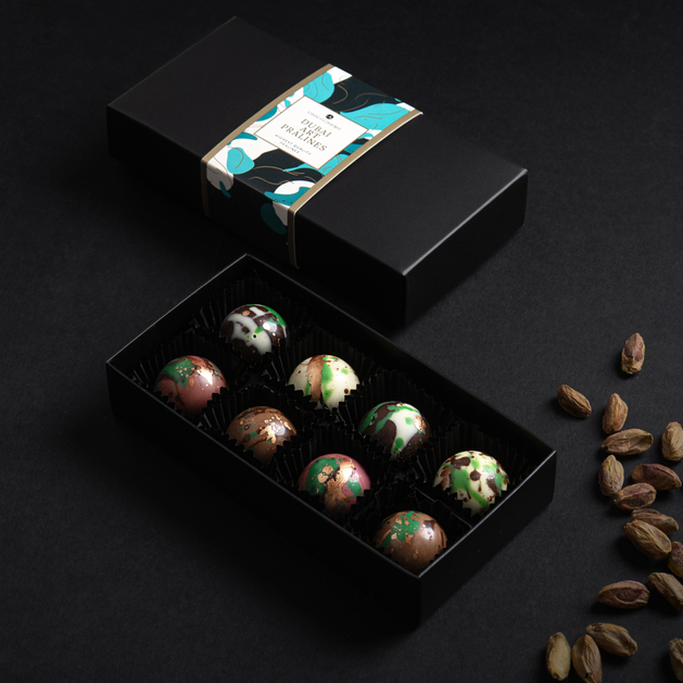 8 czekoladek dubajskich to doskonały wybór dla tych, którzy chcą zanurzyć się w orientalnym świecie pistacji i luksusowej czekolady – w większej, jeszcze bardziej satysfakcjonującej odsłonie.