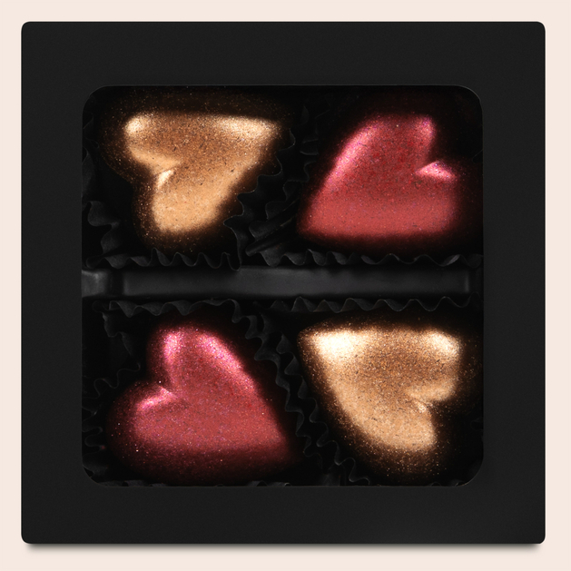 4 praliny w kształcie serc z karmelem – błyszczący symbol słodkich emocji