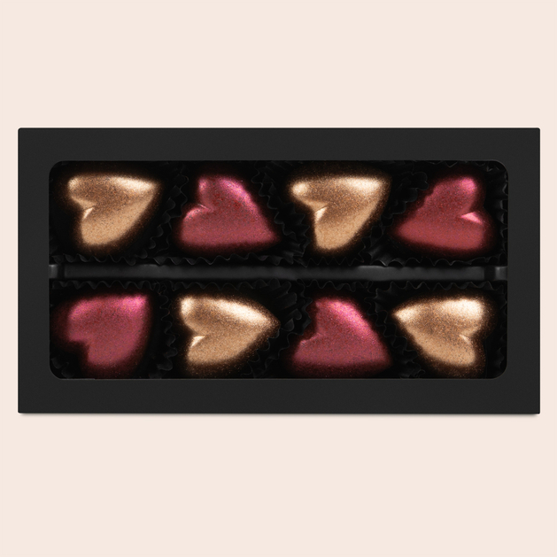 8 pralin w kształcie serc z karmelem – błyszczący symbol słodkich emocji