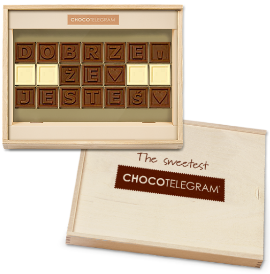 Czekoladowy Telegram® „Bardzo Cię Kocham” to wyjątkowy sposób, by wyrazić najgłębsze uczucia w niezwykle eleganckiej i smakowitej formie. Napis ułożony jest z 21 kostek belgijskiej czekolady najwyższej jakości – mlecznej i białej – które tworzą romantyczny, pełen emocji przekaz. Całość dopełniają dwie ozdobne kostki z jadalnym nadrukiem: jedna z motywem serca, druga przedstawiająca całującą się parę, podkreślające miłosny charakter prezentu.
