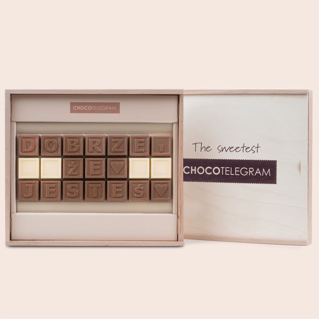 Czekoladowy Telegram® „Dobrze, że jesteś” to piękny i szczery sposób, by okazać wdzięczność, bliskość i ciepłe uczucia ważnej osobie. Napis ułożony jest z 21 kostek belgijskiej czekolady najwyższej jakości – mlecznej i białej – które tworzą subtelny, a zarazem bardzo wymowny czekoladowy przekaz.