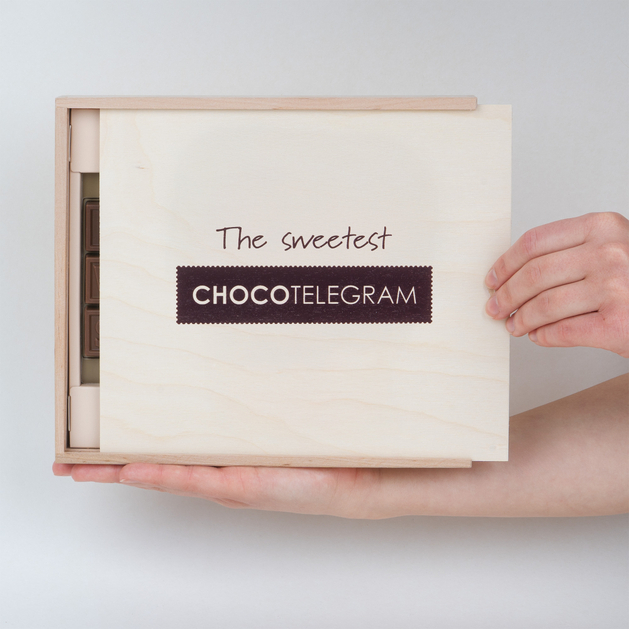 Całość zapakowana jest w elegancką drewnianą skrzyneczkę z jasnego drewna, która podkreśla naturalny i ponadczasowy charakter prezentu. Telegram powstaje bezpośrednio przed wysyłką, co gwarantuje maksymalną świeżość czekolady oraz pełnię smaku.