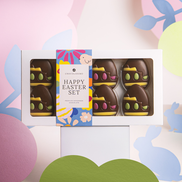 Zestaw zapakowany jest w elegancki kartonik z okienkiem i wielkanocną banderolą, dzięki czemu doskonale sprawdzi się jako świąteczny prezent lub dekoracja wielkanocnego stołu. Pisanek można również użyć jako słodkiej niespodzianki dla dzieci, chowając je do wielkanocnego koszyczka lub w ramach świątecznej zabawy w poszukiwanie czekoladowych smakołyków.